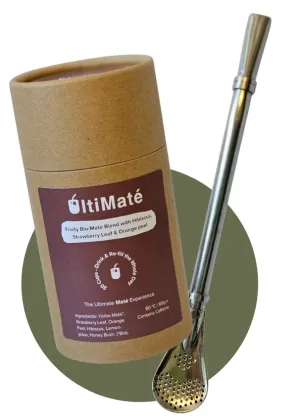 Bio-Maté met aardbeiblad, sinaasappelschil, hibiscus, citroengras en honingbos. Een gebalanceerde en fruitige blend. Bitterheid 3/5